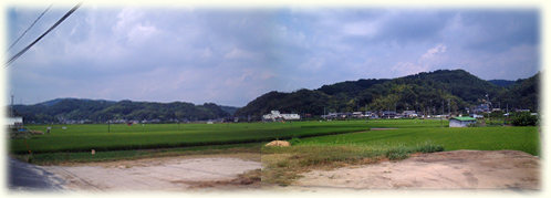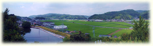 | 山の(お墓の)8合目からの景色。下に見えるのが田んぼの貯水池。写真じゃわからないけど、山の一角に土手を作ってソコに水をためてるのでもし、決壊したらこの辺りは大惨事になるね。おばちゃん家なんかいっしゅんですわ。(昔、子供の頃は本気で壊れるんじゃないかしらと思っていた。)山の上に上るとココが丘に囲まれた田園地帯だって分かるよね。右下にお墓がちょっぴり見えちゃいました。 |