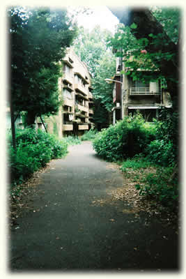 左に見えるのが27号館右に見えるのが28号館どっちも3階建ての家族向け住宅です。今ある団地の原型と言えるでしょう。「階段室型」といわれているようです。 最初の都市型団地群、西東京市の「ひばりが丘」をはじめとする、全ての団地の基礎がここにあるんですよ、旦那・・・。 まっすぐ行くと独身棟に続きます。ちなみにこの通り、この路の手前に乳房銀杏があったことは、密かに有名です。 このみち、反対側に戻ると左側が切り通しの急な階段が下ってまして、ソコが団地の東の端になっていました。つまり目の前左の27号館の裏側はがけっぷちというわけで、丘の上の街、代官山あぱーと、な訳です。 |