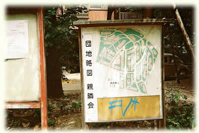 みんなが、私に突っ込むのです。なんで「団地迷宮」なんだよう?どうみたってお前が作ってるのはアパートだろお?・・・そんなあなたに朗報です。ほら、ちゃんと「団地略図」って書いてあります。親隣会が言うんだから間違いないんですよ・・・多分、うん。 ほんとに見せたかったのは後ろのほうにチラッと写ってる28号館です。オレンジの外壁が綺麗でしょ。通称「食堂館」・・・でもね。後ろに写ってる車はやっぱりビートルかしら?なんでみんなおしゃれな車持ってるのかしら?やっぱり、お金持ちの街なのね・・・ちなみに今回の写真の中で3台ゴージャスな車が写ってます。 そうそう、この辺が団地の中心でいてう通り(銭湯の前の通り)とあおぎり通りの交差点で一番賑わってたあたりです。でもビートルの後ろは階段です。