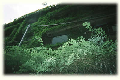 32号館と33号館の間の急な階段の入り口から右手の32号館を見上げたところです。団地全体を覆う蔦がその歴史を感じさせます。
