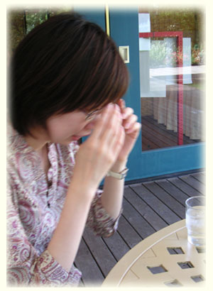 太陽の眩しさに手を翳す午後。芝生のテラス
