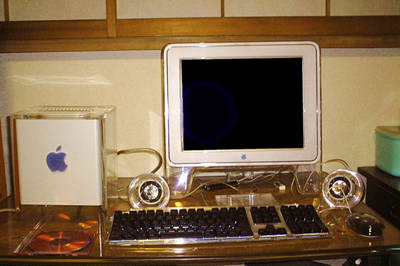 Mac G4 CUBE 2002/5/12 解説しておきます。 apple MacG4 CUBE とは、2001年に発売された新型のMacパソコンの事です。当時はその透明なアクリルの箱に浮くように設置された立方体の本体と(W25×25×H45cm)、これまた白と透明を貴重とした液晶モニタの、絶妙なデザインセンスに、コレこそMacの新しい形だと、誰もが思ったものです。・・・Kanaはそう感じました。さらに、性能のよい丸型の透明スピーカー、赤外線を使った新型マウス、それはまさに未来のパソコンのイメージだったのです。 でも・・・1つしかないDisk(しかも最初はCD-R)、2つしかないUSB、64Mしかないメモリ、 20G位のHDD容量。そのくせ、モニタと本体で25万は越えてしまう・・・。 発売後、そのデザインの中枢を担うアクリルボディに傷が発見されたり(製造上仕方ないらしい)、静電気感知のスイッチが敏感すぎたり、色々問題をつけられたうえに元来の使いにくさから(初心者用には高すぎるけれどもプロ使用には拡張できなさ過ぎる)、一気に下火。 そして、とうとう、このシリーズは販売終了でアップル社は起死回生のi Mac をこの春発売・・・ そしたら、発売終了になったとたんみんながCUBEを買いあさるのでどこにもいなくなるわ、いても値段は高いわで・・・ 結局みんな好きなんじゃんと、ちょっと嬉しいKanaでした。