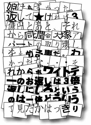 「二人合わせてセキララ」 ハイ皆さんお元気ですか?別にロジパラのように路線変更したわけじゃありませんからね。そんな白い目で見ないでくださいな。Kanaのnikkiはセキララだと人に言われます。赤裸々・・・だまされていますよ皆さん。Kanaが30になろうかというおっさんで印刷デザインをやっているって処から最早怪しいです。Kanaの真の姿を検証してみましょう。 1.実はワシは上野の不忍池の東側の岸に住んでおる。今年の冬はさむくてな。いつもパソは京急上野公園駅地下ホームのコンセントで充電しておるんじゃ。な〜に家がなくてもバブルの頃からのカードがあってな、日がな一日ネットで株を見ておれば日銭くらいは入ってくるのよな。 2.実30歳くらいの保母してます。ネットなんてサッパリ分からないので、知り合いの男の子につくってもらっています。思ったことを言えばすぐに実現してくれるので男の子は本当にすごいと思います。印刷もWebもさっぱりです。それをやっているのは男のこの方です。 3.実はネットワーク系の小学生です。系という言葉は嫌いですが、昨今よく聞く言葉なので不承ながら使っています。得意技は簡単な破壊系プログラム(ウイルスとも言います)を作成する事。世に出ているウイルスを見ながら、もっとシンプルに増殖するものを造ればいいのにといつも思っています。仲間内ではウイルスではなくて呪文と言っています。 4.18歳の女子高生です。もうすぐ卒業なのだ。小学校6年まであのアパートに住んでいて(以下3000行略) 5.少し夢見がちな妄想と想像力豊かなおじさん。こんな意味のないネタを作りながら、上の4人に名前から生い立ちまで瞬時に作ることのできる、かなりいっちゃっている自称小説家兼漫画家。 ・・・セキララからは随分飛んだような気がするけれどもこのネタも随分とセキララなKanaだなと気がつくまでにそれほどの時間はかからないのであった。激終 |