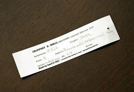 とりあえずGEOFFREY B. SMALL というブランドのLIMITED EDITIONという機軸ということはわかりました。ピアチェンザというのは、有名なカシミアの生地会社だということ、