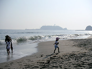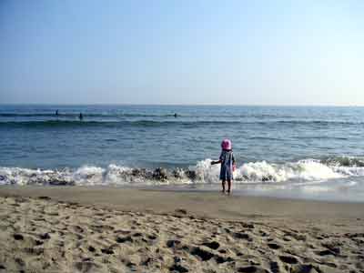 帰り際湘南高校前の海岸に下りました。早い夏なので人はまばらなのです。お子様が一人ずっとずっと波と戯れていました。小さな波に行ったりきたり、たまに来る大きな波にきゃっきゃきゃっきゃ。静かな早い夏の午後めくるめく江ノ島紀行なのでした。