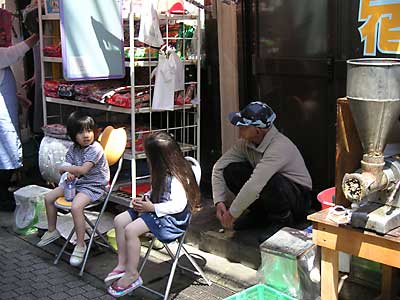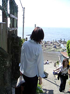 1つは魚屋のおじさんがいた路地をつきぬけて、その向こうの駐車場のそのまた先から岩場に降りる方法と(ここから降りると江ノ島の裏のほうまでずっと海岸線を歩いてゆける)2つめの仲見世どおりの脇を右に降りる方法。