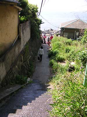 ムスメは、ばてていたけれども・・・。 この坂道は展望台の向こうの山の上の宿屋街の軒裏にいきなり到着するので初めて行ったときはとてもびっくりするのでした。エスカーに乗るよりずっと楽しいと思ったのです。