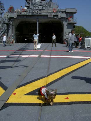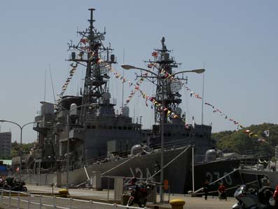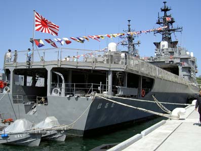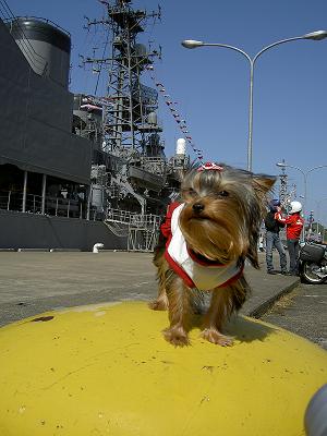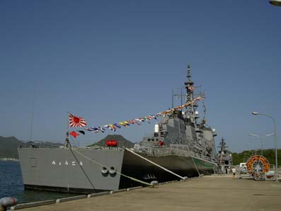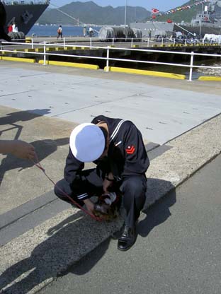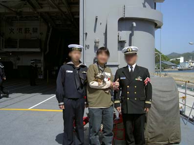 | 14:00 | その後、琴引浜へ。天の橋立を素通りしていきますがさすがにここは渋滞してました(^_^;) そして舞鶴抜けていこうとしますがふっと海の方みるとなんと軍艦はっけーん!びっくり!緊急停止しました(^_^;) 舞鶴の海上自衛隊でした。日本海沿岸の警備にあたるんですね(^。^) 八旗ぐらい常駐してたかな? いやー。現物はちゃいまんなぁ!圧倒です(~o~) 今回甲板まで見学できた「はるな」です。すごかったっす(~o~) 「みょうこう」結構人気のある艦みたいです。 ラッキーも甲板上走り回ってました。珍しいのかな? 水兵さんにもかわいがわれてご満悦のラッキー いやーいい記念なりやした(~o~) お前も海軍目指すか? |