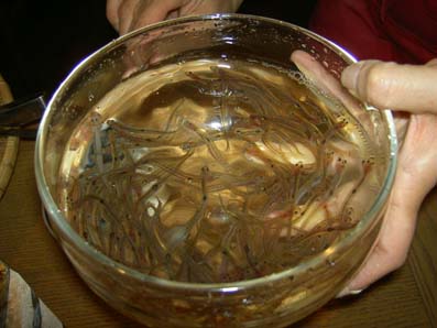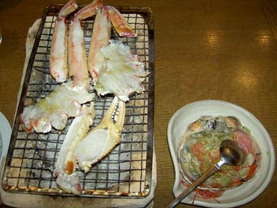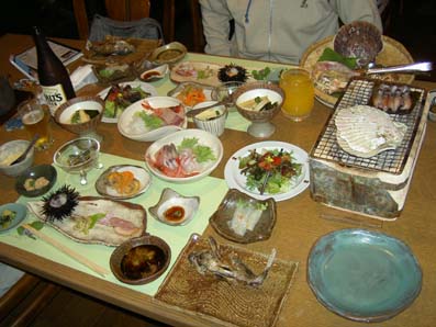 | 19:00 | ウインズ | さぁ、そして一路能登七尾湾めざして走行です。 ちょっと遅れて無事ウインズ着。 このホテルはインターネットのHPで見つけたんですが, 食事もさることながら、部屋やホテル内雰囲気もレベルが 高いもので非常に納得できるものでした。 オーナさんも気さくな方でこりゃまた北陸方面来た場合は ここですわね(^^♪ 今回の目玉。 料理も出来立てを運んでくれるので非常に料理がおいしかったです(^^♪ ずわいの炭焼きができるとの事でわくわくです。これも甘くてうまかった(^^♪ 白魚の踊り。初めての体験っす(~o~) 白魚の踊り食いですが結局食べることができませんでした(^_^;) いやー食べるのはなかなか勇気がいります。 周りの皆さんはおいしいと食べてたようです。 ちなみにかまないと食べるそうです。また次回に・・・残してすいません・・ いやーしかしここの夕食はほんとにすごかったです(~o~)大満足! |
