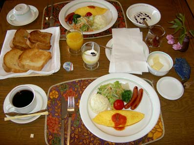 | 5月2日(月) | 10:00 | ウインズから出発 | 朝食。オーナさん手作りのジャムにパンです(^。^)おかわりしちゃいました(^^ゞ このドアすごいおしゃれでしたよ。 HPでのイメージより遥かにいいとこでした。清潔感もあり最高でした(~o~) |